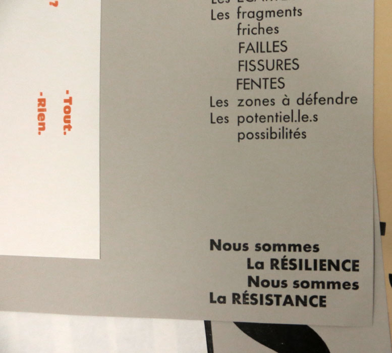 Parole dans l'espace / espace de la parole. Aurélie Pagès et m.u.r.r. ont proposé aux étudiants de l'ENSBA de Paris des expérimentations de composition/impression typographiques autour du texte poé/li/tique et de sa diffusion. Il s’agissait d'élaborer des formes et propos proches des tracts ou des flyers, et qui puissent aisément circuler de la main à la main. Avec le concours d'Aurélie Pagès et la participation de : Antoine Alzieu, Margot Bernard, Emma Boudon, Caroline Culcasi, Juliette Duchemin, Marine Ferrari & Mattéo Sita.