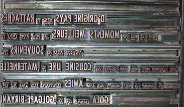 Prenant pour objet d'étude le quartier des Quatre Chemins dans lequel est implanté l'atelier - un quartier en mutation qui soulève nombre de questions d'architecture et d'urbanisme - Timothy Perkins et m.u.r.r. ont accompagné un groupe d'étudiants de l'ENSCI dans l'exploration de ces lieux et dans la manière dont ils pouvaient en rendre compte par le procédé typographique. Quatre chemins en typographie est une proposition s'inspirant du livre Loss de Timothy Perkins, éditions Ma Bibliothèque - The good reader, 2015. Vifs remerciements à Mme A. Hume Principale du collège Jean Lolive (arch. de J.Kalicz) et à Mme G. Michel, conservatrice du Pôle Mémoire de Pantin. Avec la participation de Rémy Aufort - Jacques Averna - Nathan Bonnaudet - Ophélie Decantere - Louna Garcia - Adélie Lacombe - Antonin Odin - Louise Raguet.
